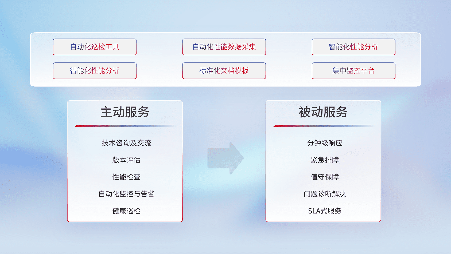 智能化工具和标准化文档,,,保障服务质量,,,提供主动服务(包含技术咨询、、、版本评估、、性能检查、、自动化监控与告警、、健康巡检)和被动服务包含(分钟级响应、、紧急排障、、、、值守保障、、、、问题诊断解决、、、、SLA服务)。。